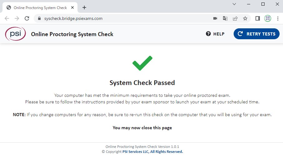 A2 パソコンへの機能・仕様の要求は厳しい。 以下のURLで事前チェックできる。 ページを開いたら、右上に青く表示されている【 RUN COMPATIBILITY CHECK】 ボタンを押す。 https://syscheck.bridge.psiexams.com/ 画面上にカンニングツールが開いていないかチェックされる。 OKの場合は、こういう表示になる。 |